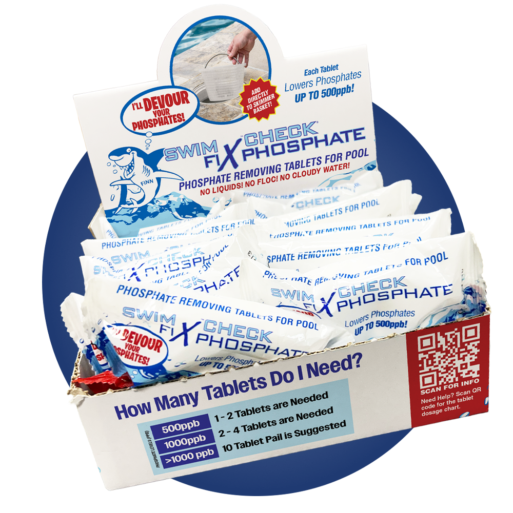 The Swim Check Fix™ Phosphate tablet uses a patent pending time release solution to get rid of your phosphate problem. Depending on several factors like size of pool, temperature of water, and amount of phosphates, the tablet can slowly dissolve for up to a month. After four weeks, simply discard any residual tablet from the skimmer.